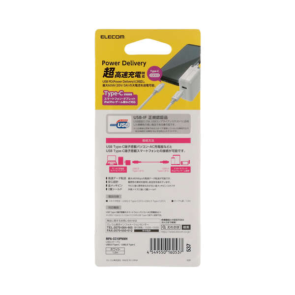 USB Power Delivery(最大60W)に対応し、スマートフォン・タブレットを超高速充電!USB Type-C端子を搭載した機器同士の接続ができるUSB2.0ケーブル。