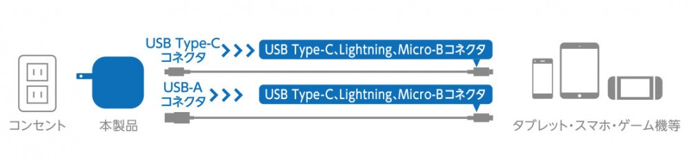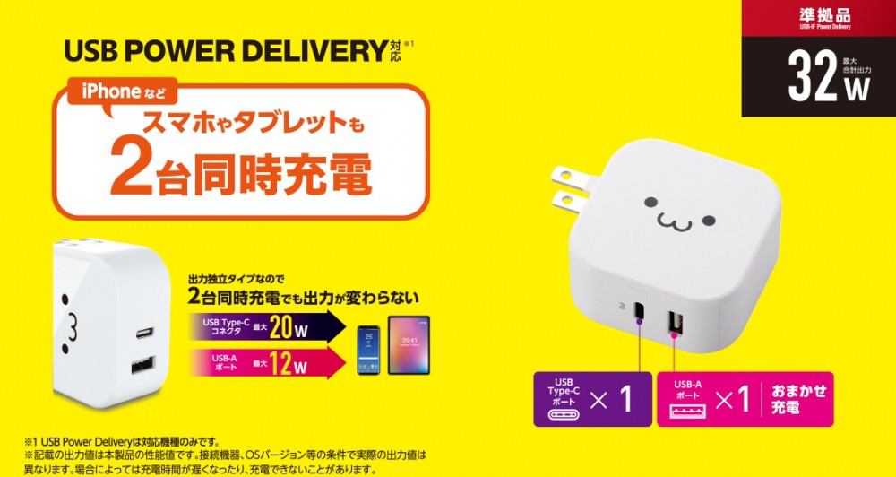 USB Type-C(USB-C)ポートとUSB-Aポートを搭載し、2台同時充電できるUSB AC充電器