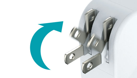 未使用時は電源プラグを折りたたんでACアダプタ本体に収納できる90°スイングプラグを採用しています。