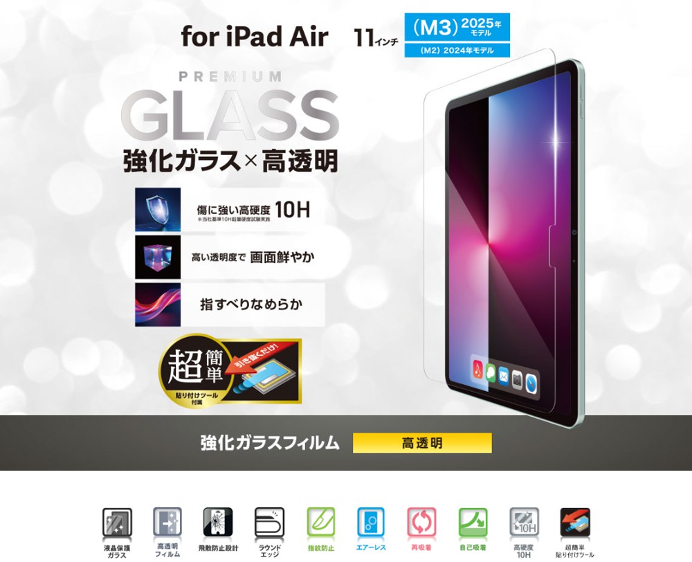エレコム iPadAir 11インチ(M3/M2)/ガラスフィルム/高透明/簡単貼り付けツール付
