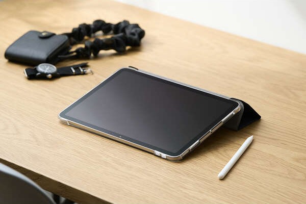 持ち歩き時に画面を保護するフラップ付きです。フラップを閉じるとスリープモードになり、開けるとスリープから復帰します。