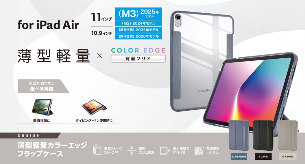 エレコム iPadAir 11インチ(M3/M2)/フラップケース/薄型軽量/背面クリア/フレームカラー