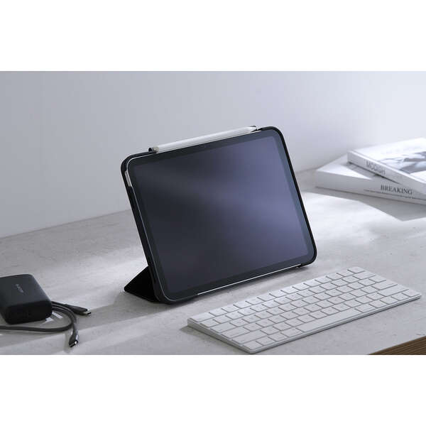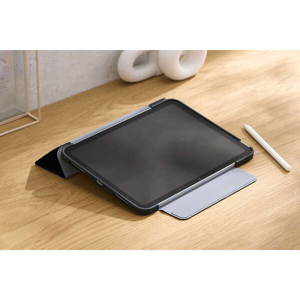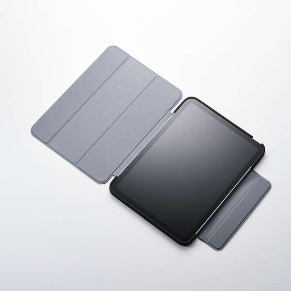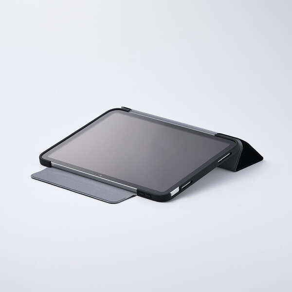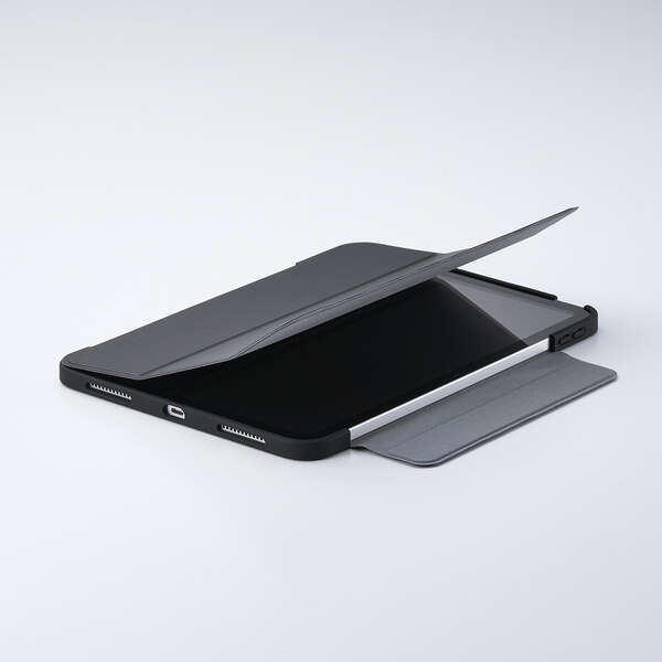 持ち歩き時に画面を保護するフラップ付きです。フラップを閉じるとスリープモードになり、開けるとスリープから復帰します。