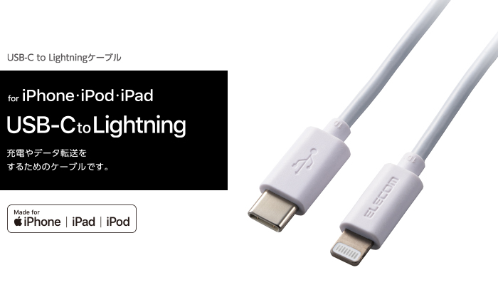 Lightningコネクタを搭載したiPhone・iPod・iPadと、USB-Cポートを搭載したパソコンを接続し、充電・データ転送ができるUSB-C to Lightningケーブルです。