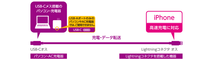 ※USB Power DeliveryまたはThunderboltに対応したUSB-Cポート付きのパソコン・充電器の場合に高速充電が可能です。