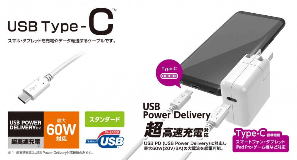 USB Power Delivery(最大60W)に対応し、スマートフォン・タブレットを超高速充電!USB Type-C端子を搭載した機器同士の接続ができるUSB2.0ケーブル。