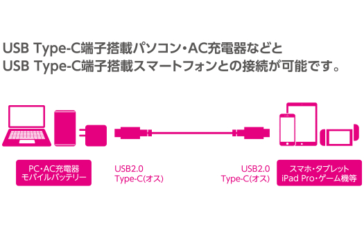 USB Type-Cを搭載しているパソコン及び充電器、モバイルバッテリーなどに、USB Type-Cを搭載しているスマートフォンやタブレットを接続し、充電やデータ転送ができるUSB2.0ケーブルです。