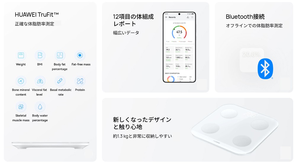 HUAWEI Healthアプリに接続されていなくても、体組成計に乗れば、体重だけでなく、体脂肪率の測定結果も直接スケールに表示されます。