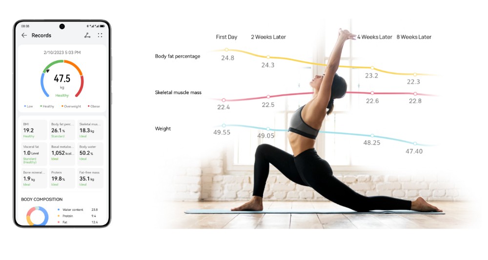体重体組成計をBluetoothで「HUAWEI Health」アプリと接続することによって、グラフで週、月、年単位で体重、体脂肪率、骨格筋量の変動推移を確認可能です。