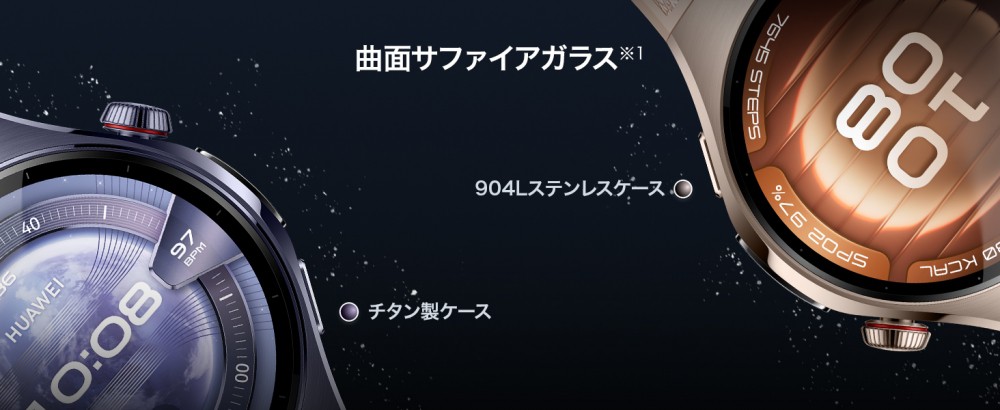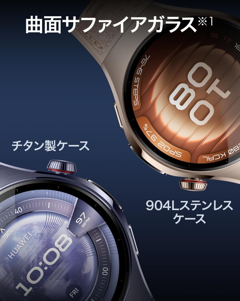 46mmモデルは航空宇宙グレードのチタン合金、42mmモデルには904Lステンレススチールを採用。曲面サファイアガラスやLTPO2.0 AMOLEDディスプレイなどハイエンド素材を多数使用。未来的なテクノロジーを流線型のフォルムに詰め込みました。