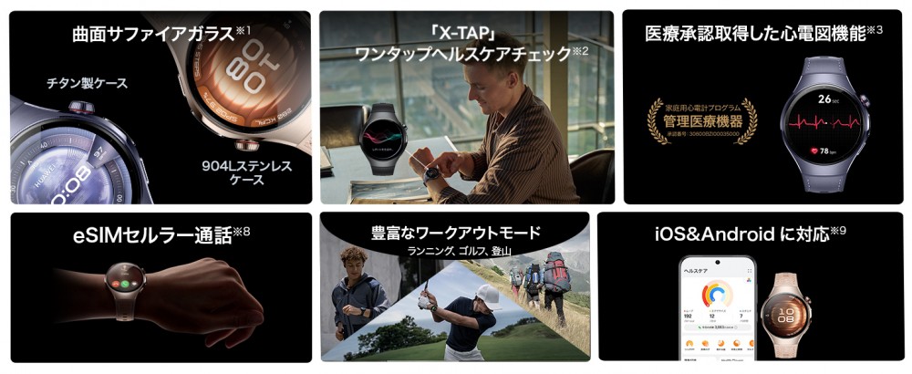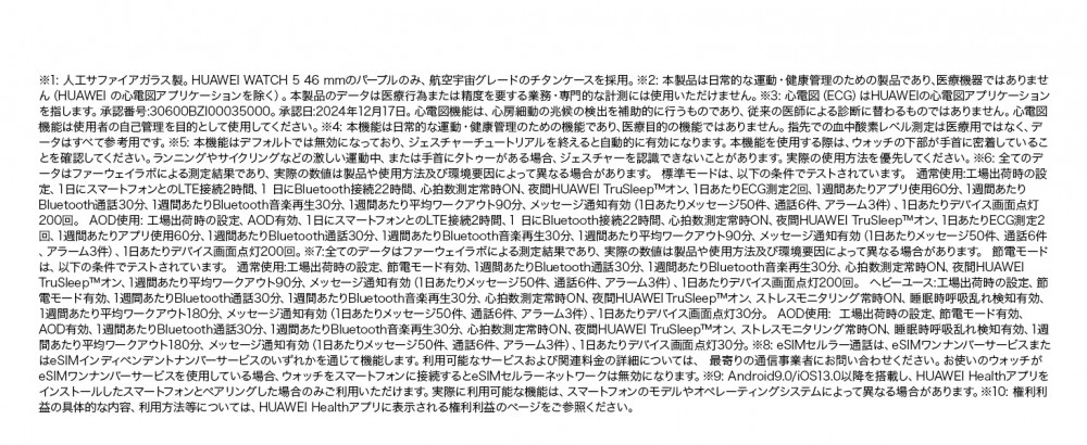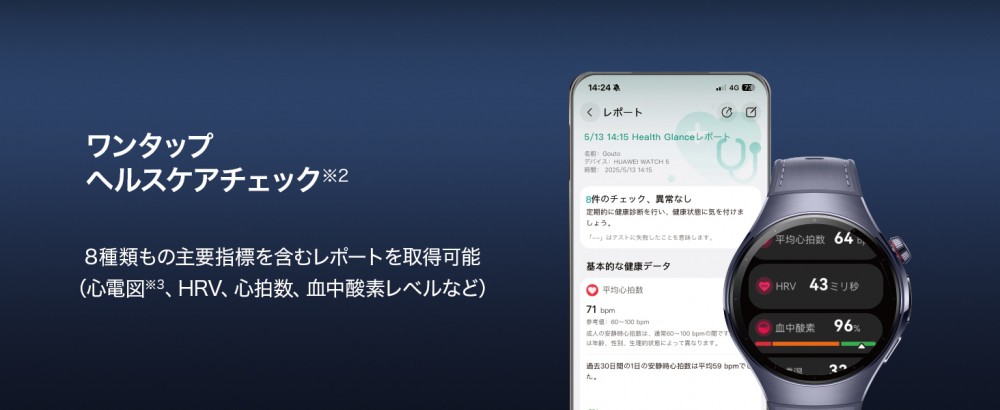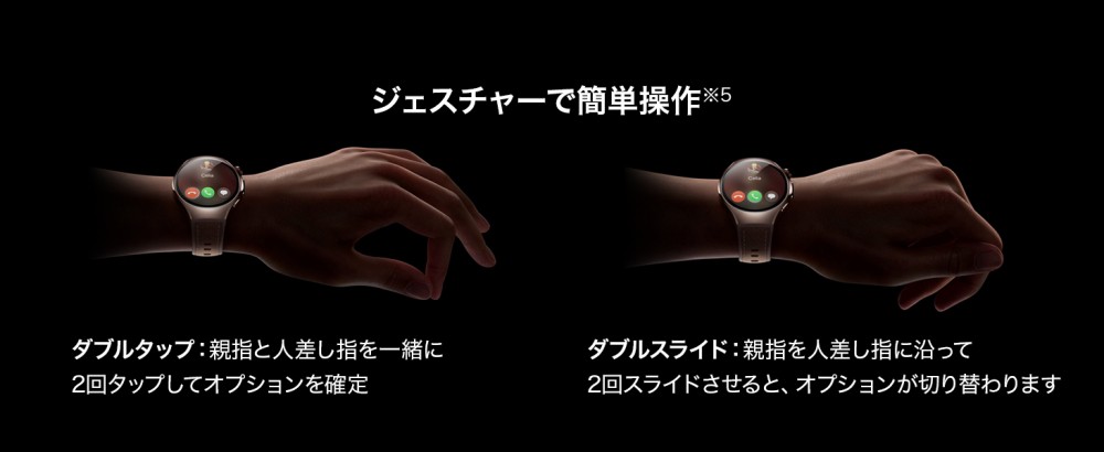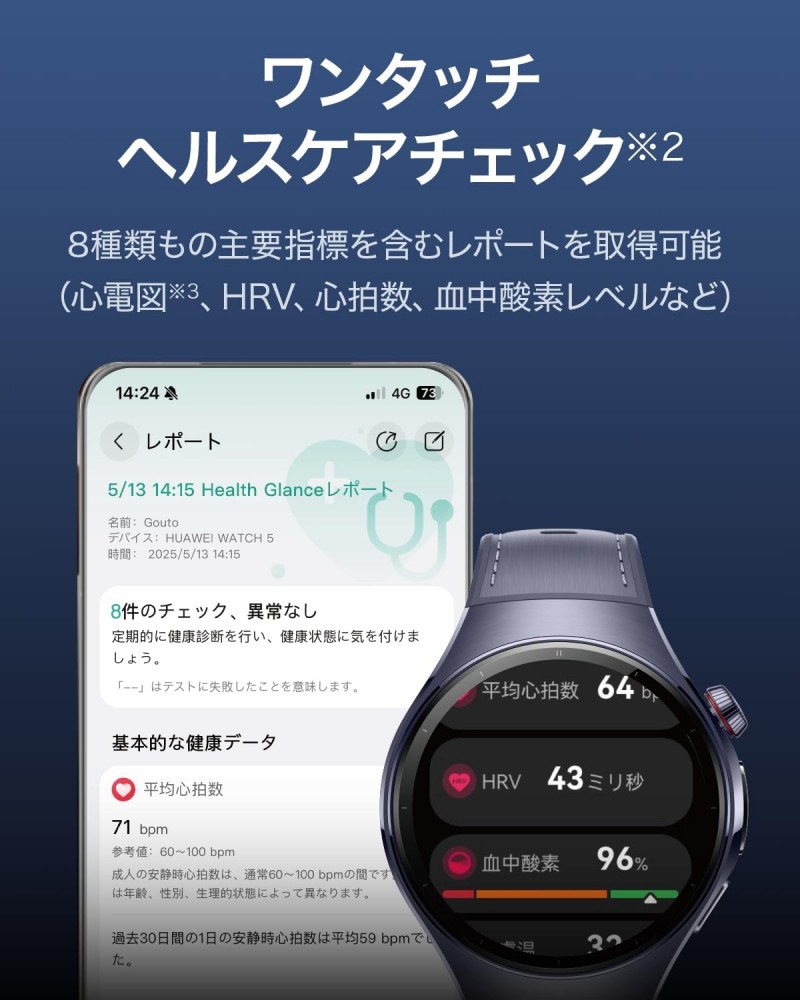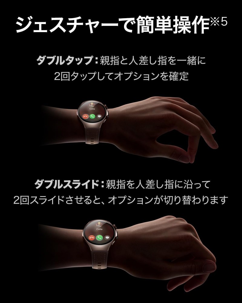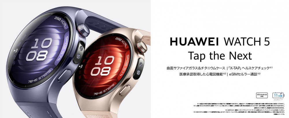 曲面サファイアガラスと航空宇宙グレードのチタン合金ケースを採用したHUAWEI WATCH 5は、指先でのリアルタイム血中酸素レベル測定とスマートジェスチャー操作が可能。また、毎日のニーズに対応できる2つのバッテリーモードを搭載、わずか数秒で簡単に切り替えることも可能。