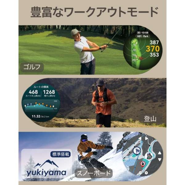 ゴルフ、フリーダイビング、トレイルランニング、ランニングフォーム分析、情緒モニタリング、心電図分析など様々な機能を搭載。