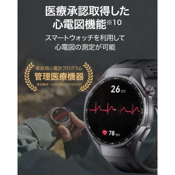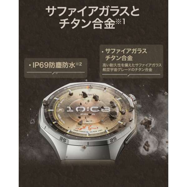 高強度のサファイアガラスと航空宇宙グレードのチタン合金 HUAWEI WATCH GT6 Pro 46mm ゴルフ、フリーダイビング、トレイルランニング、ランニングフォーム分析、情緒モニタリング、心電図分析など様々な機能を搭載。 HUAWEITruSenseシステムにより、心拍数、睡眠、情緒などでより多くのデータをモニタリング可能。 最長21日間のバッテリー駆動を実現。 ■パワフルバッテリー 圧倒的な持久力を誇る、約21日間使えるパワフルバッテリー。 革新的なハイシリコンバッテリーの採用により、エネルギー密度が前製品より約37%向上。 たった1回の充電で、思う存分アドベンチャーを楽しめます。 ■プレミアム素材 プレミアムなサファイアガラスを採用し、透き通る美しさと高い耐久性を実現しています。 ※画像はイメージです。