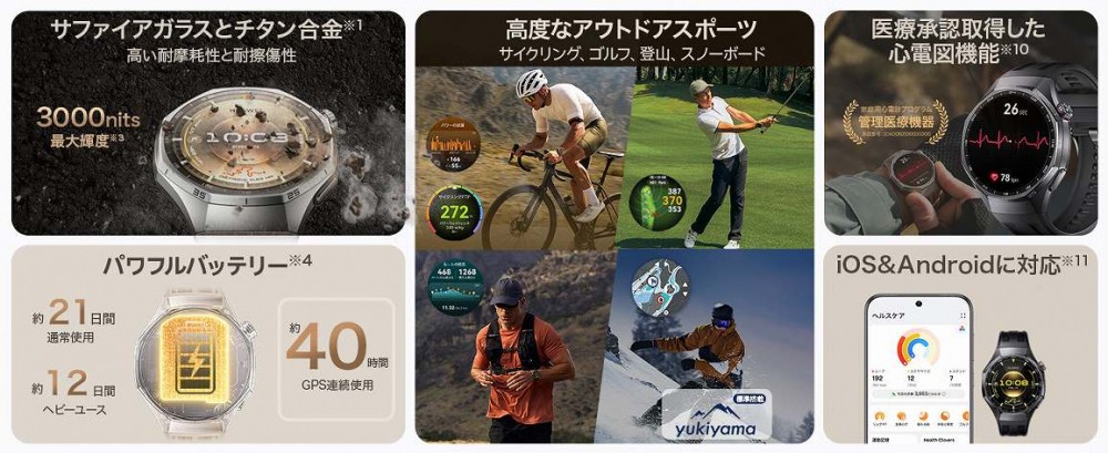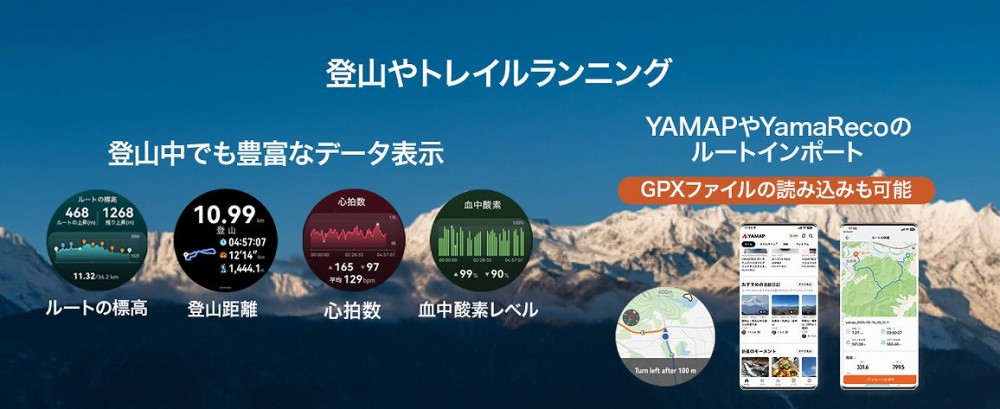 ゴルフ、フリーダイビング、トレイルランニング、ランニングフォーム分析、情緒モニタリング、心電図分析など様々な機能を搭載。