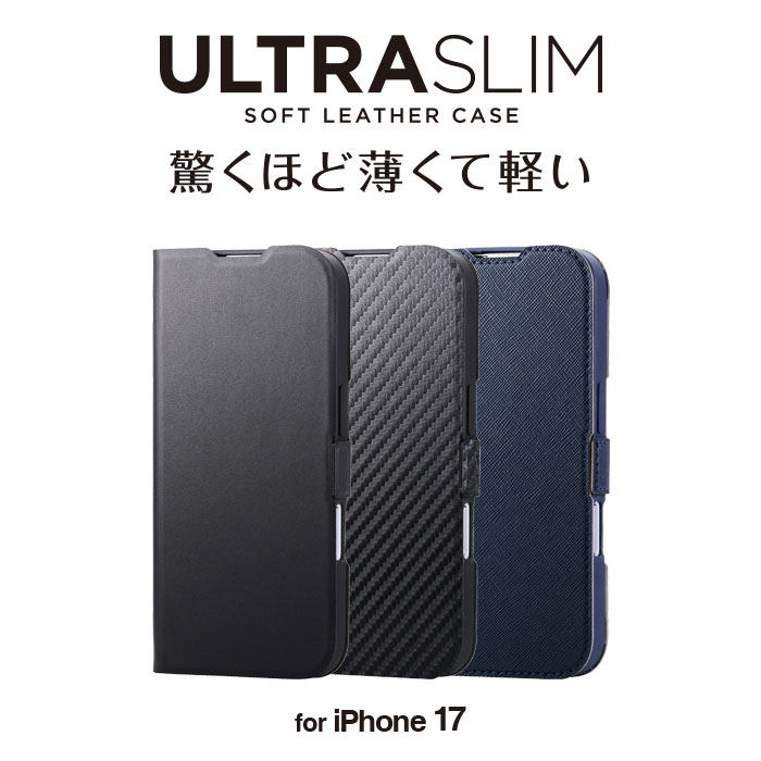 端末の薄さや軽さを損ねない、薄型・超軽量なウルトラスリムタイプの手帳型ケースです。 エレコム iPhone 17/手帳型ケース/薄型/磁石付 薄型・超軽量なウルトラスリムタイプのソフトレザーケース。 端末を衝撃から守る 端末装着部分に衝撃を吸収するTPU(熱可塑性ポリウレタン)素材を使用し、端末を衝撃から守ります。 効率的に衝撃を吸収 落下時に最も大きな衝撃が予想される四つ角にエアークッションを設置し、効率的に衝撃を吸収します。 横開きタイプのフラップ 不使用時に画面部分をカバーする、横開きタイプのフラップが付いています。 マグネットフラップ マグネット付きフラップなので、ワンタッチで簡単に開け閉め可能です。 ※画像はイメージです。