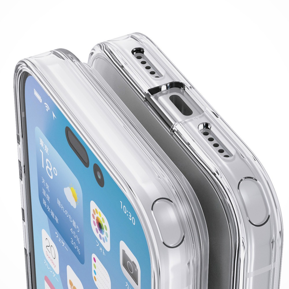側面には弾力性のあるTPU(熱可塑性ポリウレタン)素材を、背面には強じんで透明度の高いポリカーボネート素材を使用した、スリムなスタイルのハイブリッドケースです。