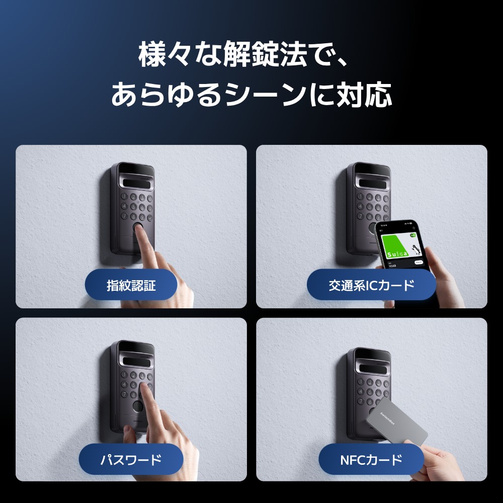 指紋認証やパスワードの入力をはじめ、SuicaやPASMOなどの交通系IC、NFCカードなどを使った解錠にも対応します。また、交通系ICカードをスマホやスマートWatchに登録すれば、スキャンするだけで解錠できるように。指紋の登録上限は100個までで、家庭用からオフィス用までご利用いただけます。通常用/期間限定/ワンタイム/緊急用、合計4種類のパスワードを設定することができ、家族との同居、友人の短期滞在、家事代行サービスなどあらゆるシーンに合わせてパスワードを使い分けられるのも魅力です。