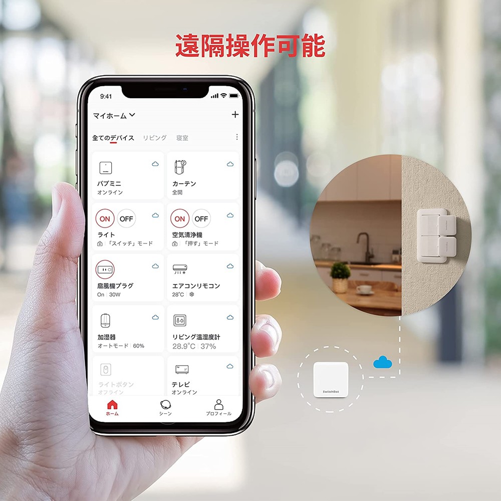 押すだけ家電をスマート化 スイッチボット ボタン押し スイッチ押し スイッチ操作 物理スイッチ ボタン自動化 家電操作 スマートスイッチ スマートホーム ワイヤレス タイマー スケジュール ルーティン 自動化 アプリ操作 スマホ操作 遠隔操作 音声操作 アレクサ Alexa グーグルホーム GoogleHome Google Home シリ Siri IFTTT イフト ハブ必要 ハブ併用 ※画像はイメージです