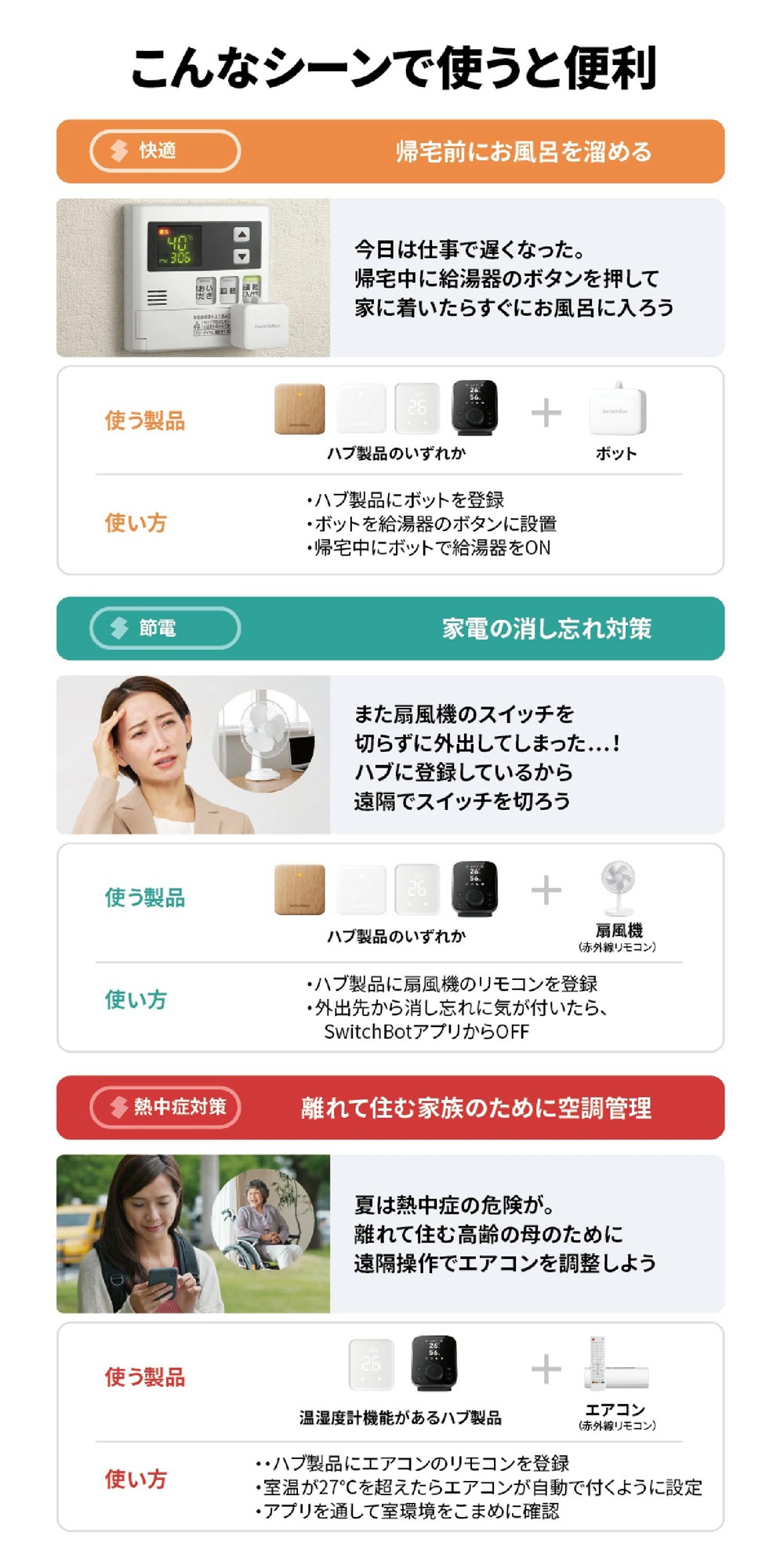 SwitchBotハブシリーズ製品またはSwitchBotシーリングライトシリーズ製品と併用して、外出先からスマートフォンで照明・家電をコントロールすることができます。帰宅時に前もって照明をつけることで真っ暗な部屋を手探りで帰宅する必要はありません。忙しい朝はエアコンをつけっぱなしで外に出てしまった時でも、遠隔操作でエアコンを消せます。電気の消し忘れを防ぎつつ、省エネ?節電に役立ちます。また、出張や旅行で、長時間不在になる時は、遠隔操作でスイッチをON/OFFすることで防犯対策にもなります。