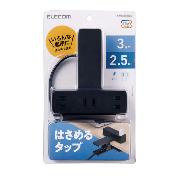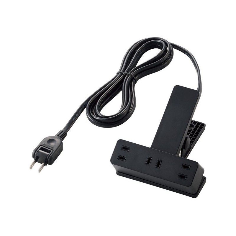 机などに挟んで利用することができるクリップ機構を搭載した2ピン式の3個口タップです。