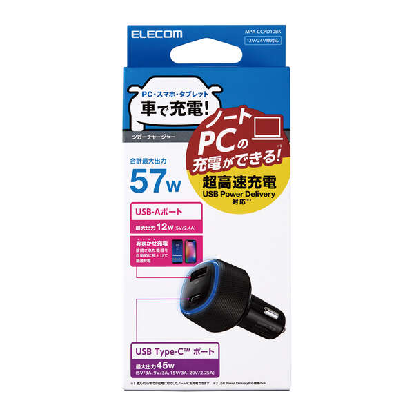 エレコム シガーチャージャー/合計57W/USB Power Delivery45W+12W/Type-C×1/USB-A×1