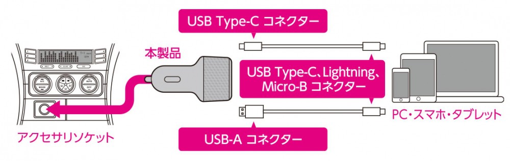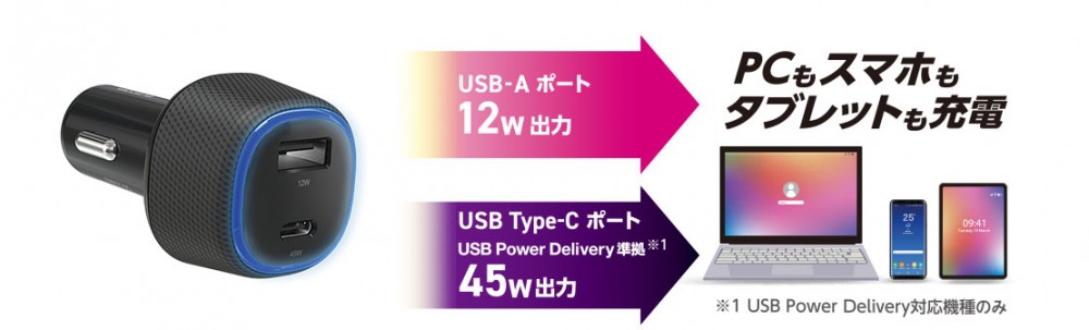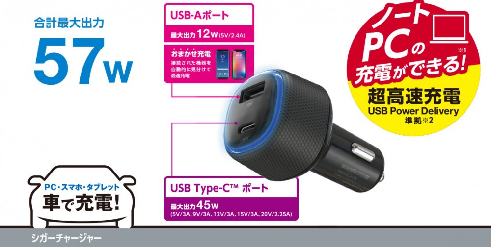 USB Power Delivery対応のノートパソコンやスマートフォンを車で超高速充電