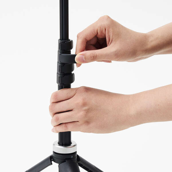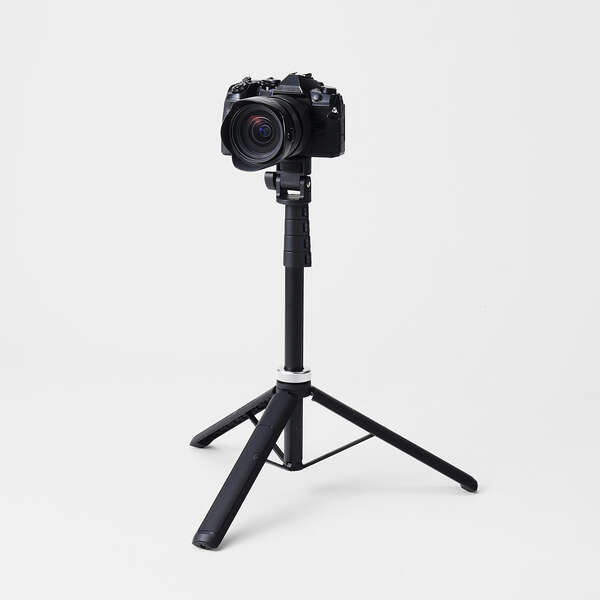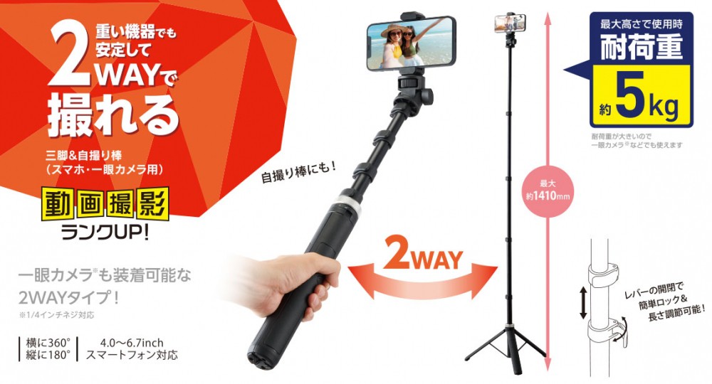 脚を収納すると自撮り棒としても使用できる2Wayタイプのスマホ三脚です。撮影シーンによって使い分けられます。一眼レフカメラなど重い機器も安心して取り付けが可能。1/4インチネジを採用し、さまざまなアクセサリーが使用できます。