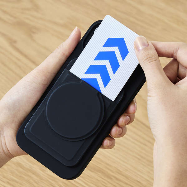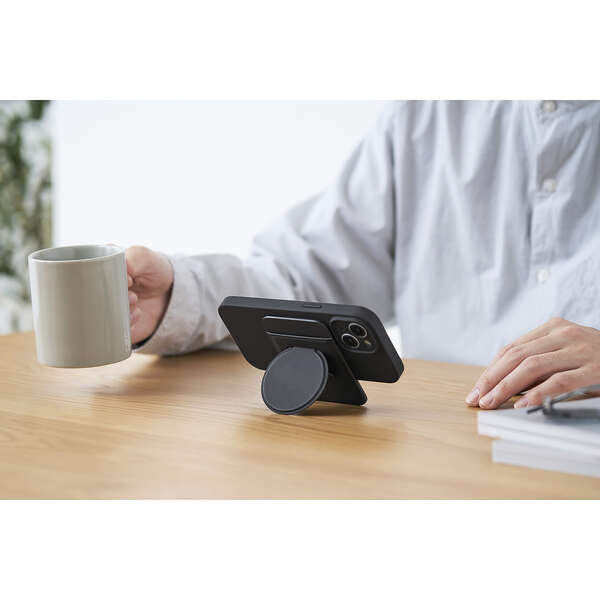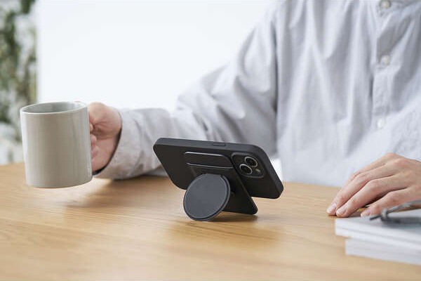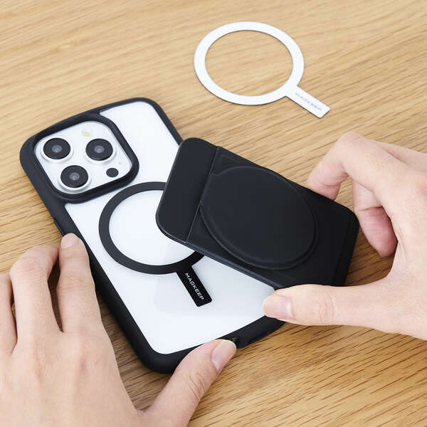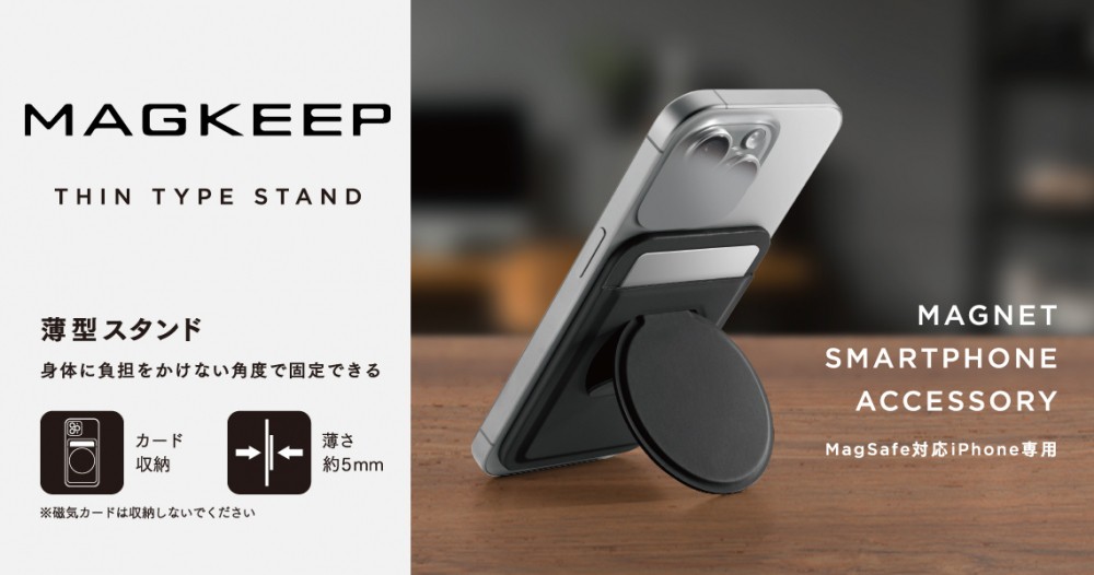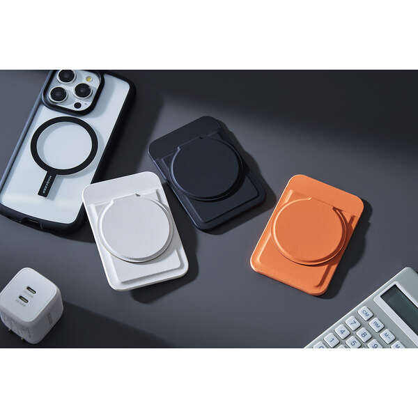 MagSafeで簡単に着脱できる、カードポケット付きのスマートフォン用マグネットスタンドです。
