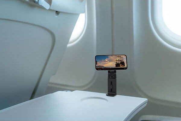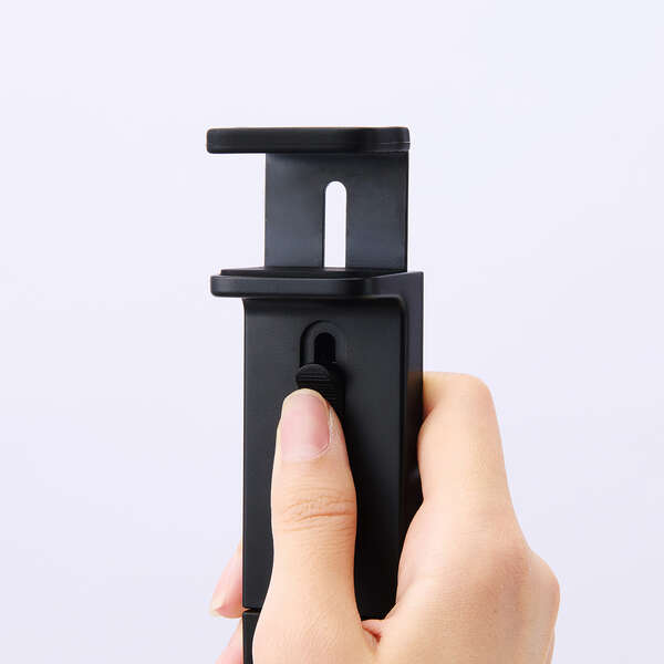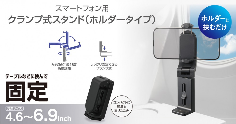天板に挟んで固定できる、クランプ式のスマホスタンドです。新幹線や飛行機内の座席テーブルでの使用にもおすすめ。4.6~6.9インチまでのスマートフォンをしっかり固定できる、ホルダータイプです。