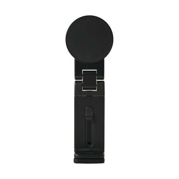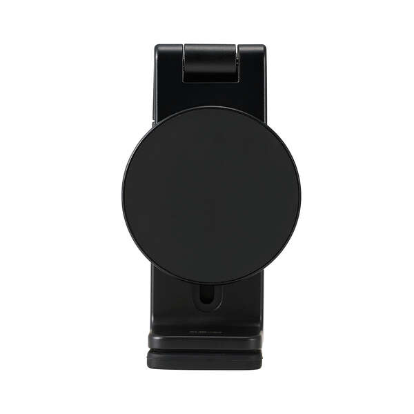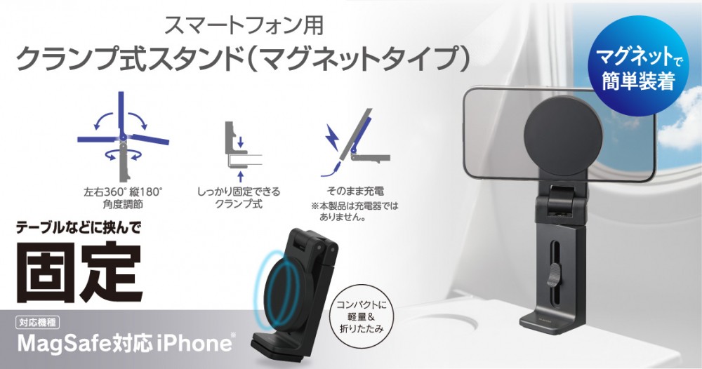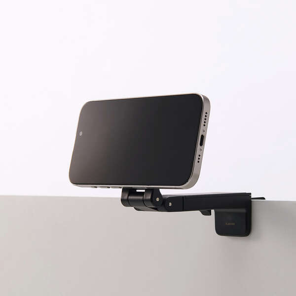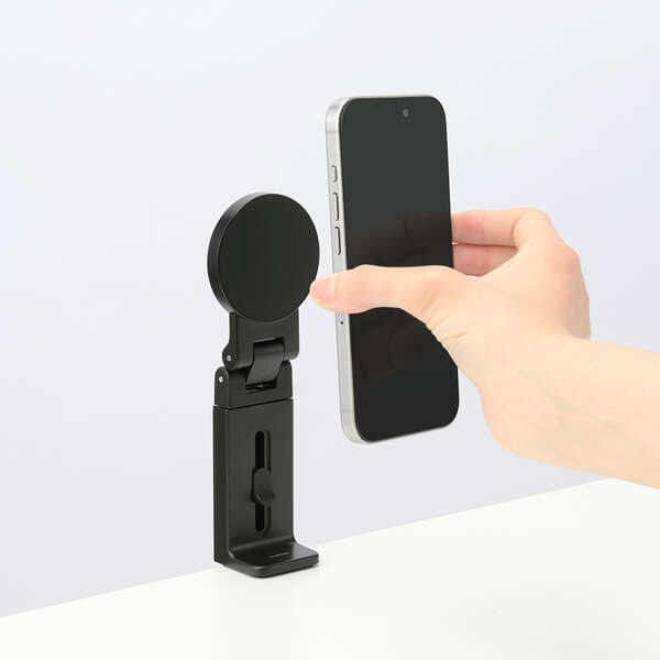 天板に挟んで固定できる、クランプ式のスマホスタンドです。新幹線や飛行機内の座席テーブルでの使用にもおすすめ。マグネットで簡単にスマートフォンの着脱が可能で、MagSafe非対応の機種でも使用できるメタルプレートを付属しています。