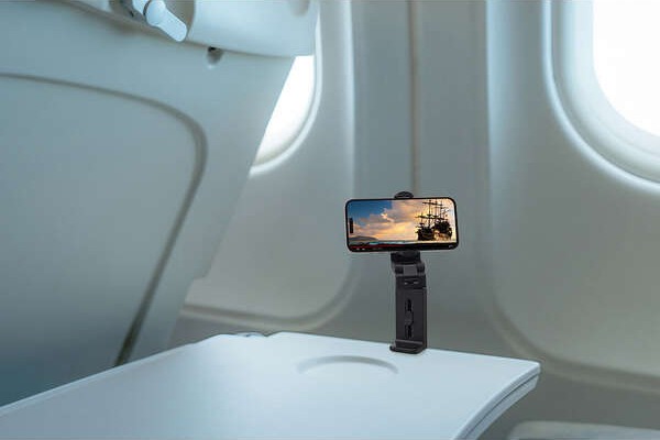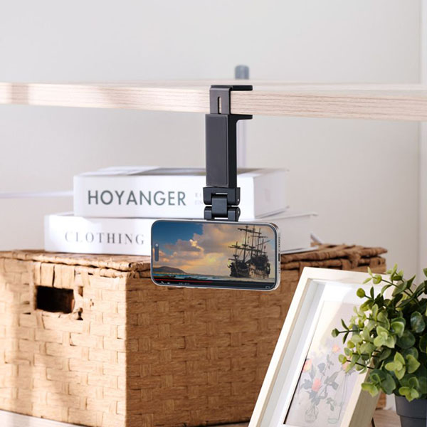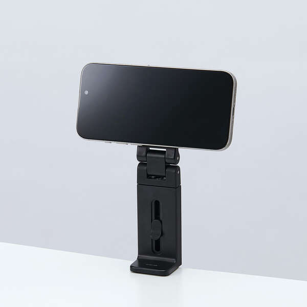 デスクなどの水平な天板に挟んで固定できるクランプ式で、スマートフォンを手に持たずにWebサイトや動画の閲覧を楽しめます。新幹線や飛行機内の座席テーブルでの使用にもおすすめです。