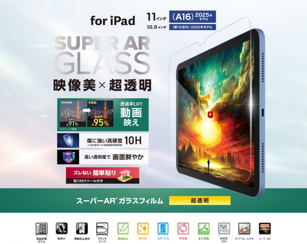 エレコム iPad11インチ(A16)/10.9インチ(第10世代)/ガラスフィルム/動画映え/超透明/ガイドフレーム付