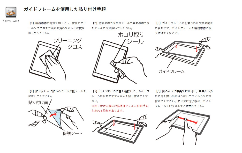 【6】図のように中央を貼り付け、中央から外に気泡を押し出すようにしてフィルムを貼り付けてください。貼り付け完了後は、ガイドフレームを取り外してご使用ください。