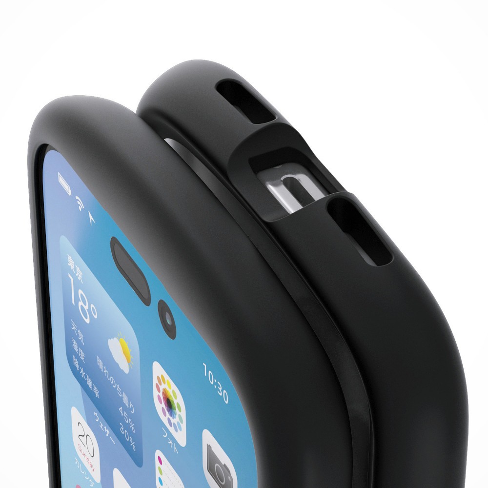 全周に配置した独自設計のエアークッションが衝撃を吸収し、背面には高硬度のポリカーボネート素材を採用。中央のくびれ形状に平坦な面を設けることで、手に馴染む快適なグリップ感を実現したGrippyシリーズのハイブリッドケース、フレームカラータイプです。