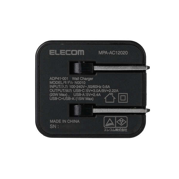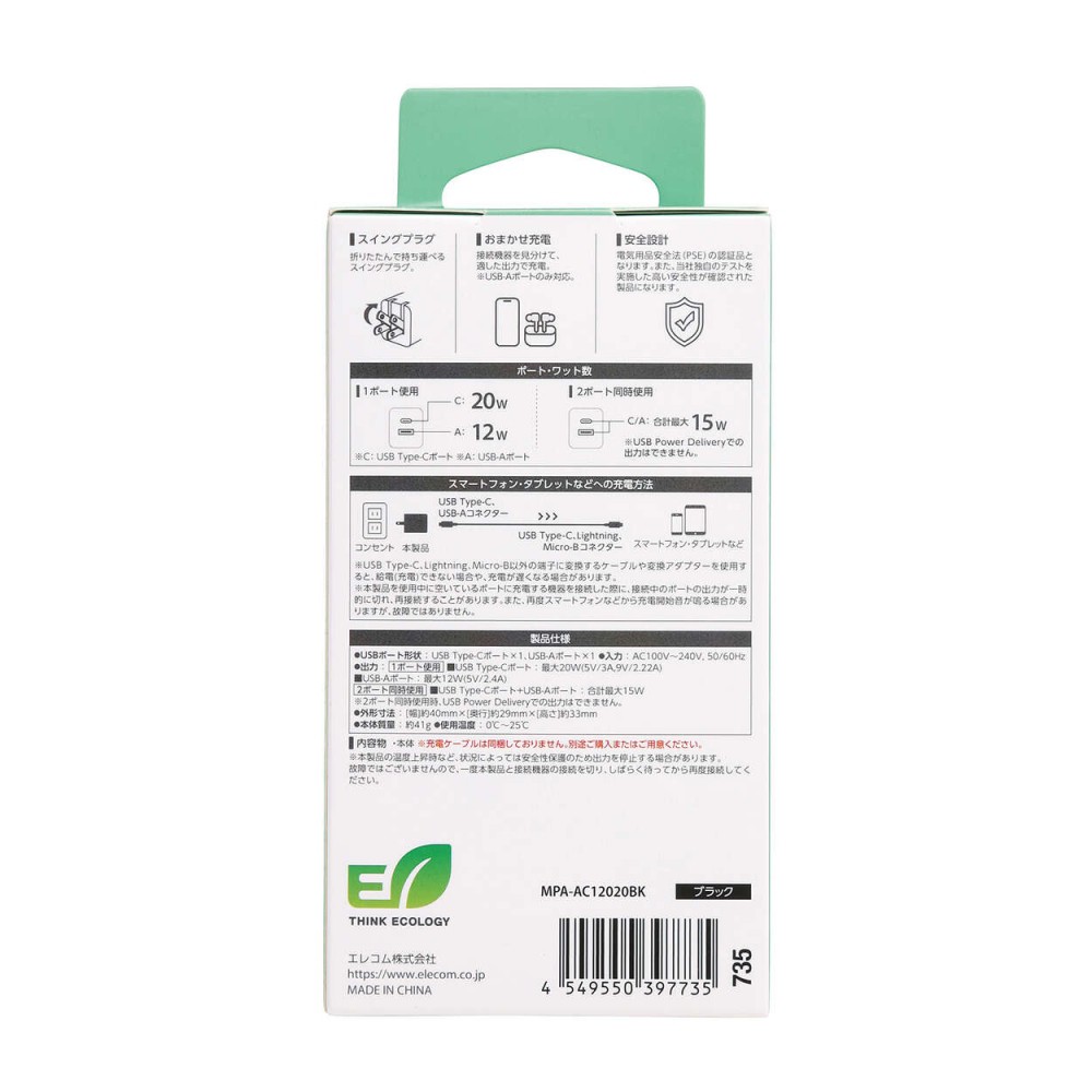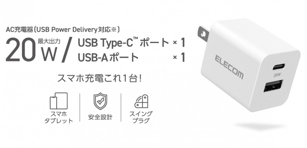 エレコム AC充電器/USB充電器/スマホ・タブレット用/USB PD対応/20W/USB-C/USB-A/スイングプラグ