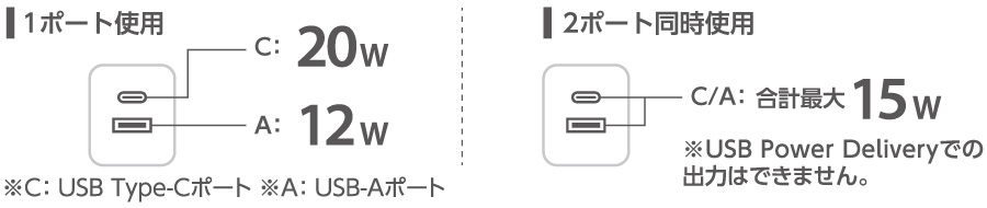 ※2ポート同時出力時は合計最大15Wとなります。(USB Power Deliveryでの出力はできません)