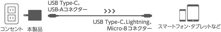 ※USB Type-C、Lightning、Micro-B以外の端子に変換するケーブルや変換アダプターを使用すると、給電(充電)できない場合や、充電が遅くなる場合があります。