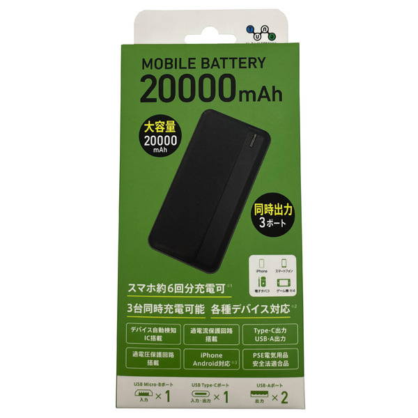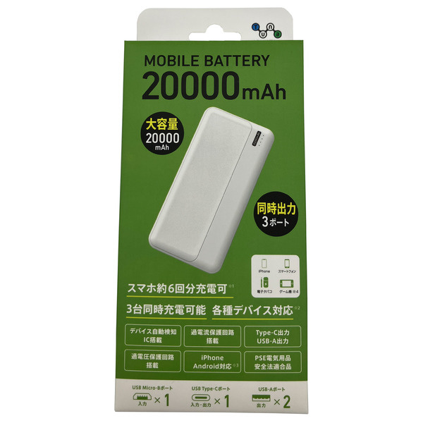 大容量20,000mAh モバイルバッテリー 3台同時充電可能