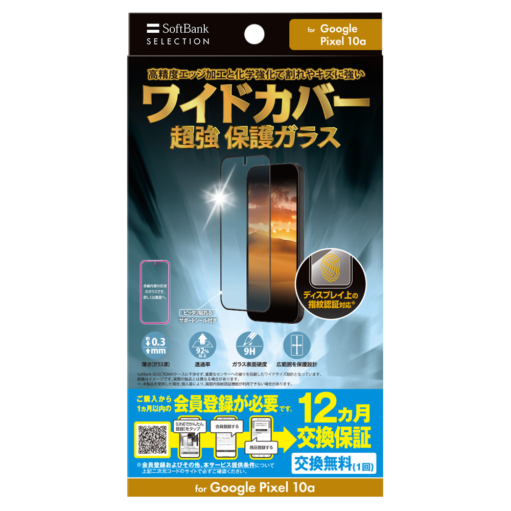 ソフトバンクセレクション グーグル ピクセル10a ピクセルシリーズ ガラスフィルム スマホ保護フィルム 画面保護 ワイドカバータイプ 端まで広く保護 ケース干渉しにくい 黒フチ付き 一体感 エッジ強化 高精度エッジ加工 超強化ガラス 表面硬度9H 割れにくい エッジ強度 約3倍 高透明 透過率92%以上 高画質 指紋認証対応 画面内認証対応 飛散防止 12か月交換保証 対象 SB-A112-GAGG/USFL