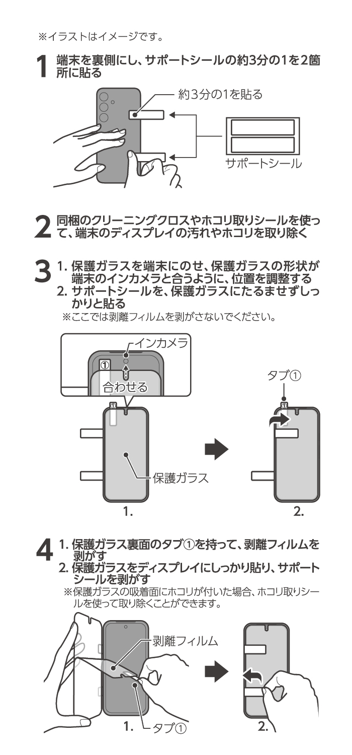 製品構成 保護ガラス×1、クリーニングクロス×1、ホコリ取りシール×1、サポートシール×2、 取扱説明書/保証書×1