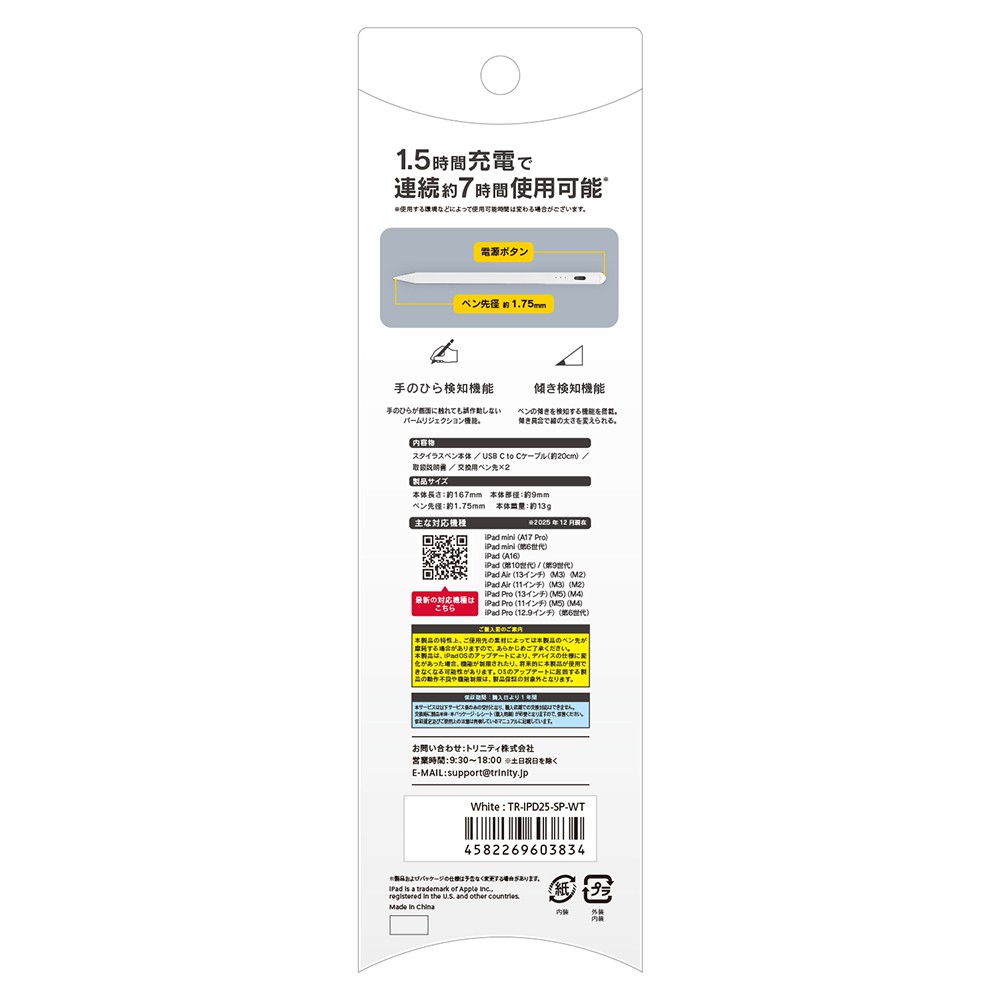 トリニティ スタイラスペン iPad専用 パームリジェクション 傾き検知 TR-IPD25-SP