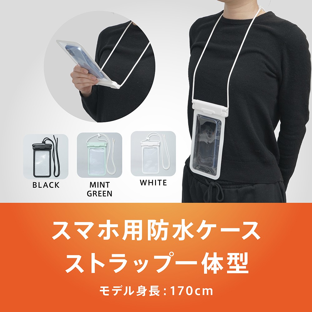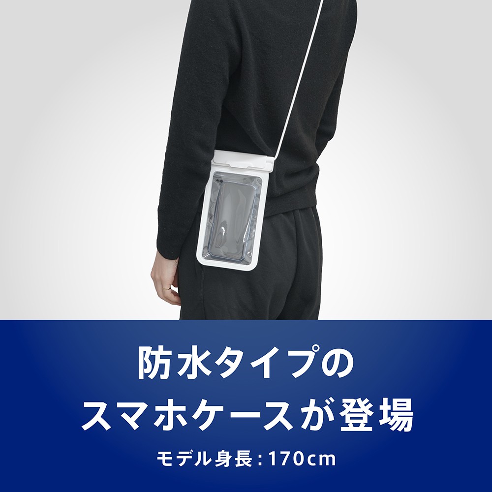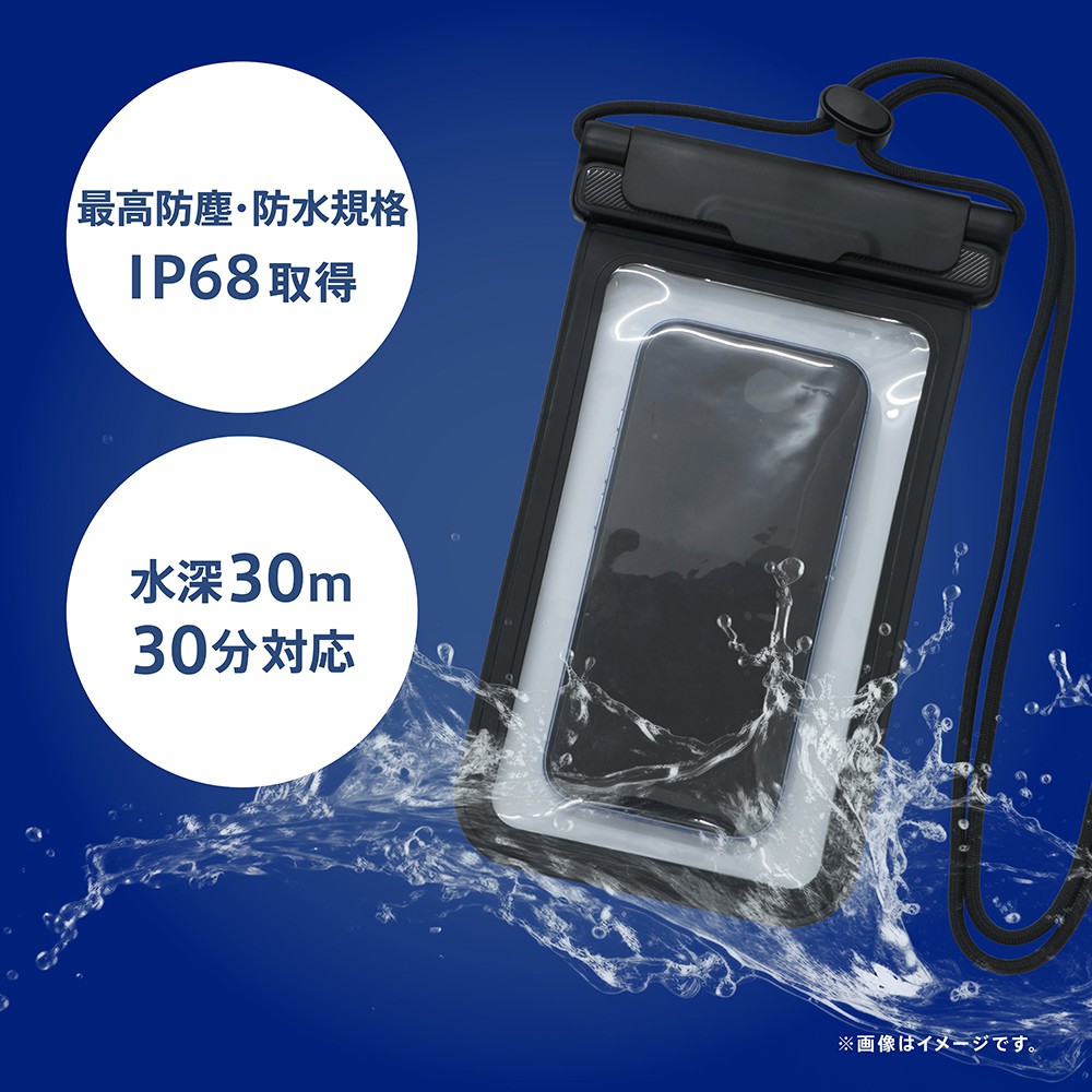 水深30mで30分まで使用可能なスマートフォン用防水ケースです。ストラップ一体型で、端末の紛失などを防ぎます。