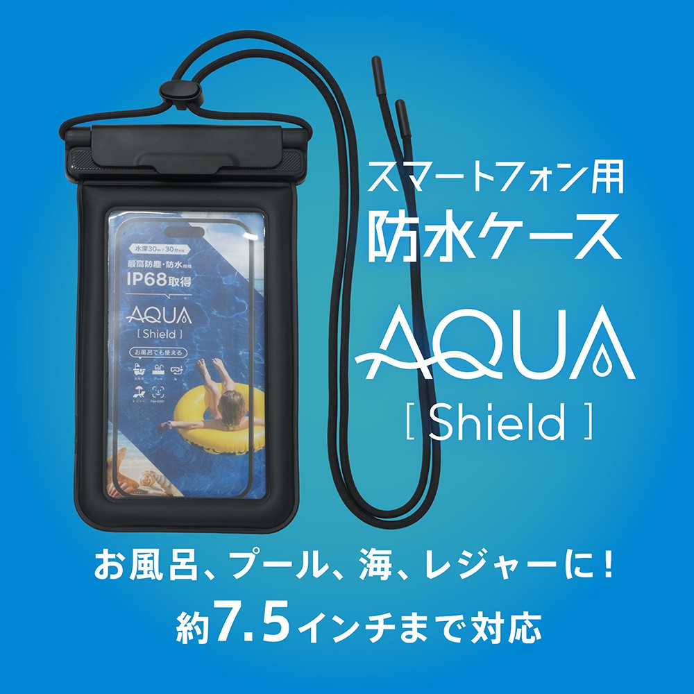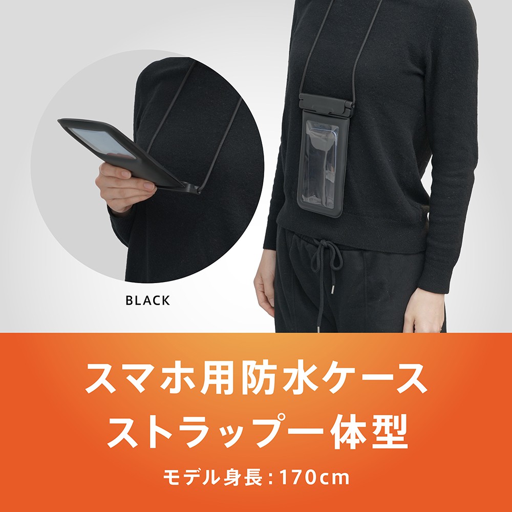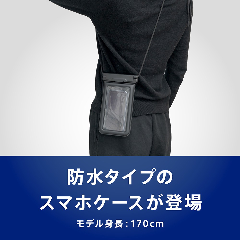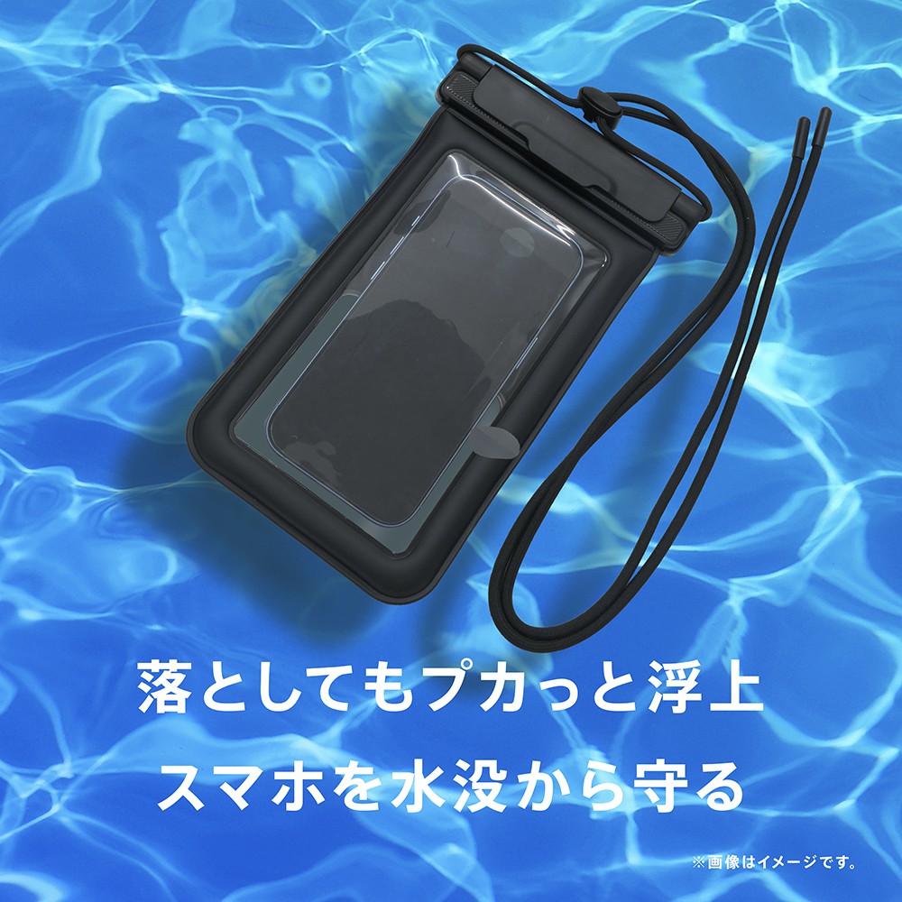 水に浮くスマートフォン用防水ケースです。ストラップ一体型で、端末の紛失などを防ぎます。