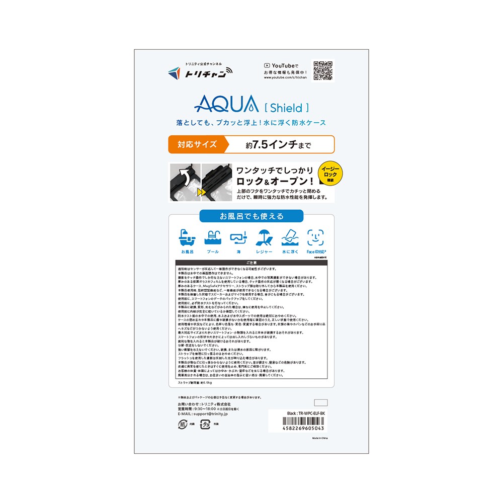 4582269605043 トリニティ AQUA Shield 防水ケース 水に浮くフロート IP68 イージーロック クッションフレーム ブラック TR-WPC-ELF-BK 2,580円 4582269605043