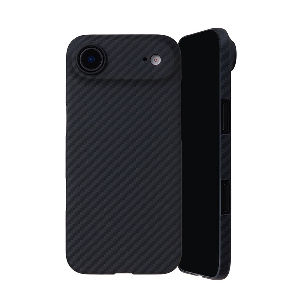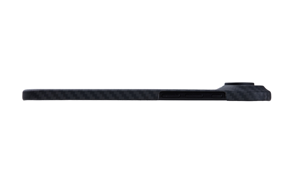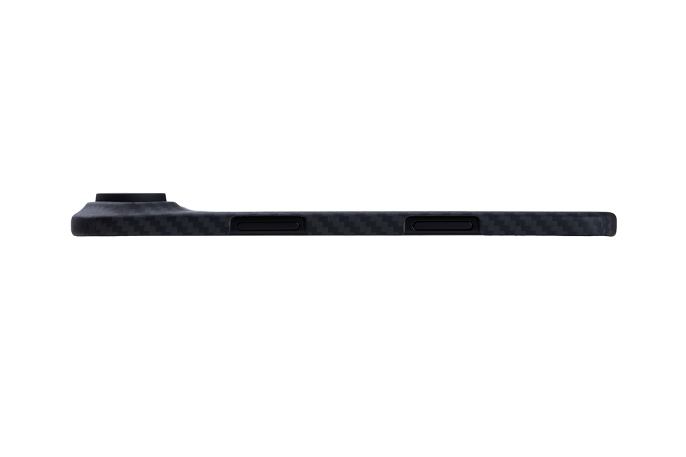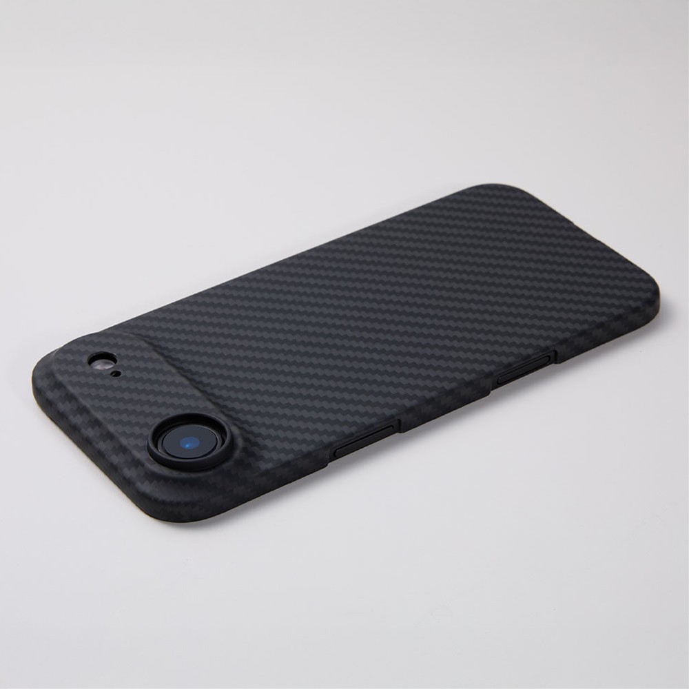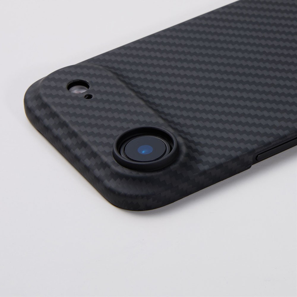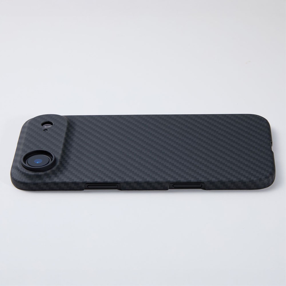 アラミドで全てを覆わずにカメラの台座までをピッタリと成形し、レンズの鏡筒部はアルミ合金のフレームを加えてガードしました。これによりケース全体の肥大感を低減してスッキリとした外観にまとめています。