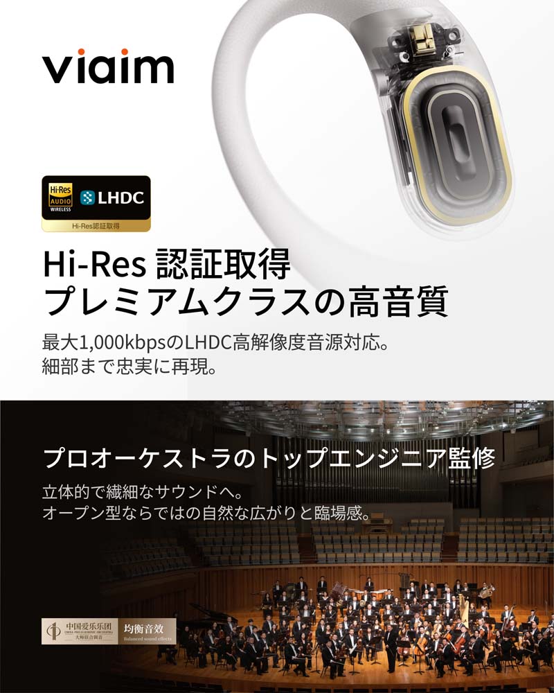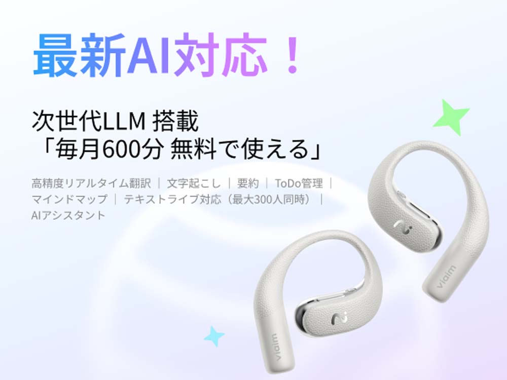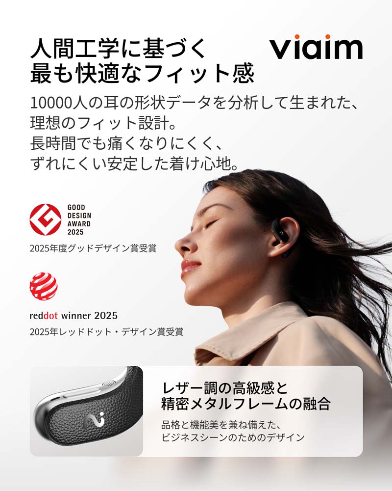「関連情報」オープンイヤー型次世代AIイヤホン AI通話・話者識別 viaim OpenNote AIイヤホン ハイレゾ対応 ヴィエイム ワンタッチで録音 文字起こし 翻訳 要約 78言語対応 長時間バッテリー 1年保証 Hi-Res Audio Wireless認証 2025グッドデザイン賞受賞