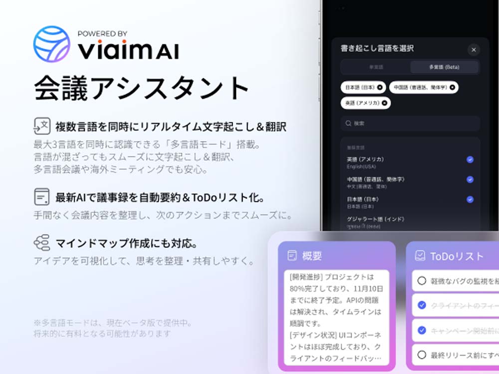 viaim(ヴィエイム)は、AIとハードウェアの融合で「働き方の未来」をかたちにするブランドとして、10年以上にわたり音声認識・自然言語処理を中心としたAI技術を磨き、スマートデバイスを開発してきた技術者たちにより2021年に誕生。2025年現在、シリーズ累計販売数100万台突破、世界180以上の国・地域のビジネス現場で活用されています。これからも“使いやすい”を徹底的に追求し、誰もがAIの力を自然に使いこなせる社会へ。viaimは、あなたの働き方に寄り添いながら、未来を動かすテクノロジーを届けます。