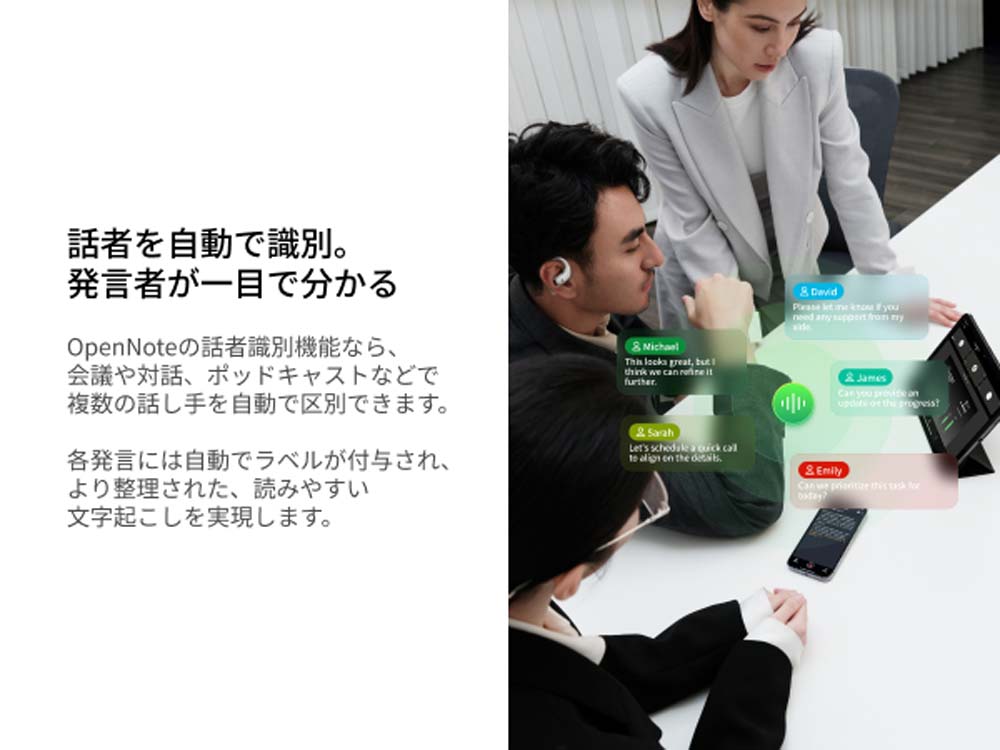 「viaim OpenNote」は、デュアルマイクとAIアルゴリズムによるAI通話ノイズキャンセリング機能を搭載。オフィスや屋外、カフェなどの雑音環境下でも相手の声を明瞭に抽出し、クリアな通話品質を実現します。さらに、会議や対話、ポッドキャストなどで複数の話し手を識別する話者認識機能を搭載。各発言には自動でラベルが付与され、誰が話したかが一目で分かる整理された文字起こしが可能です。