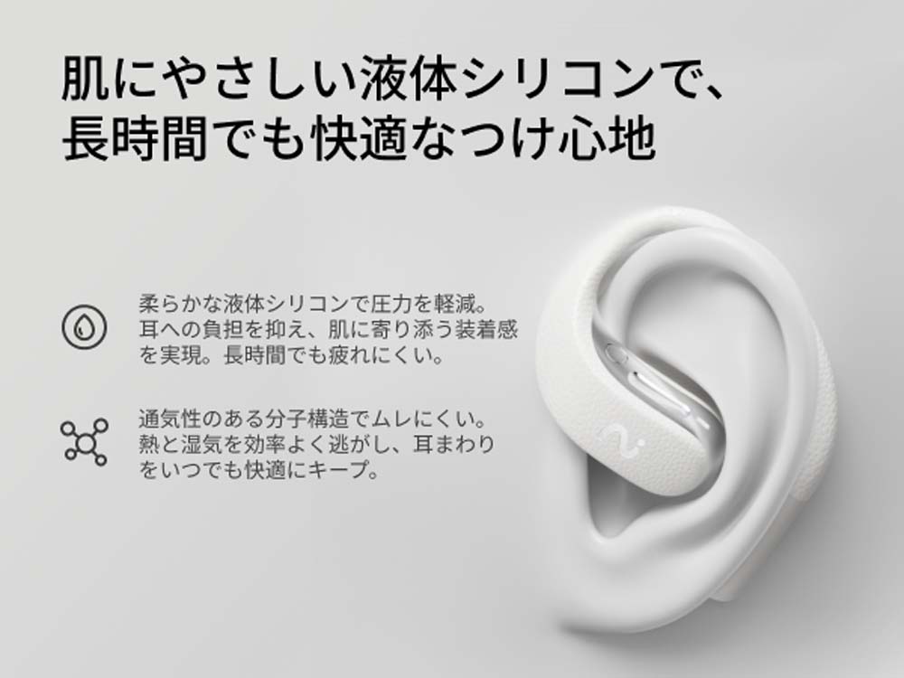 さらに、肌にやさしい液体シリコン素材を使用し、耳への圧力を分散。通気性に優れた構造でむれにくく、長時間でも快適な装着感をキープします。