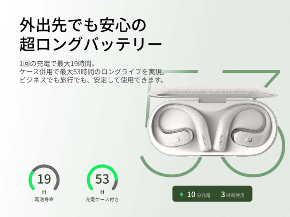 さらに、充電10分で最大3時間再生、単体19時間+充電ケース併用で最長53時間駆動。